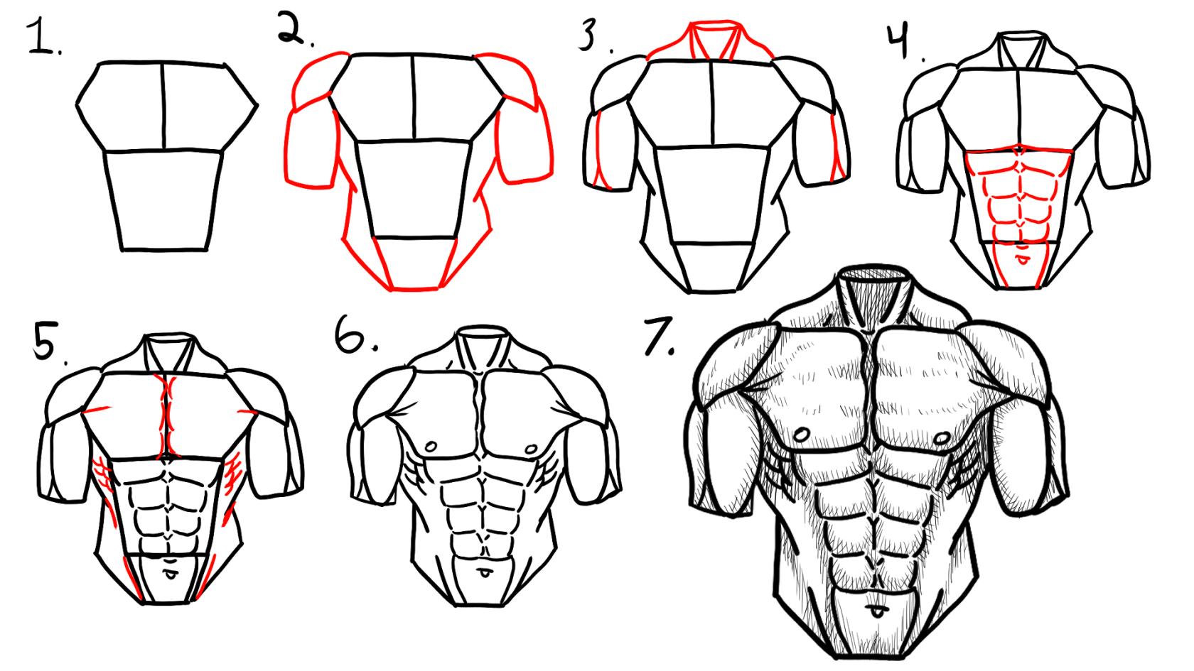 This is a step by step reference sheet for how I draw the male torso. Whenever I draw anything, I like to break everything down to basic shapes and then detail from there. For each step you would draw the red lines to progress the drawing. I tried to make it as simple as I could without using too many steps so I hope this helps!